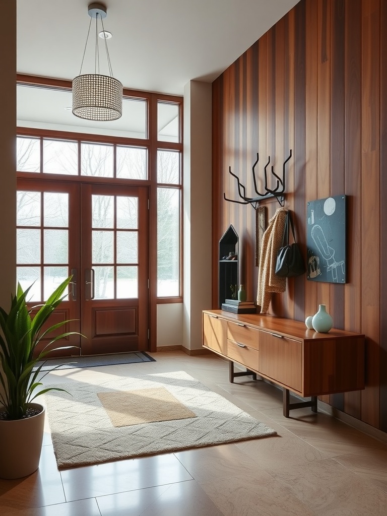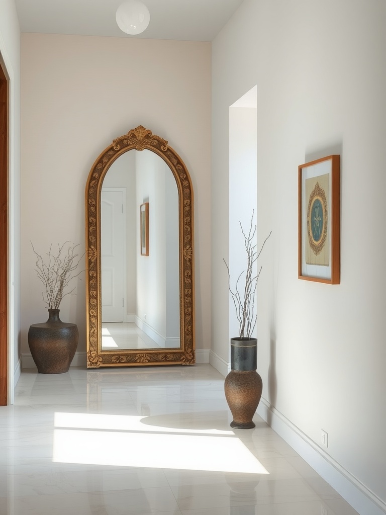 Mirrors are a timeless addition that can visually enlarge your entryway and amplify natural light. Positioning a large, decorative mirror opposite a window can create an airy, open feel, enhancing the overall brightness and welcoming vibe of the space.