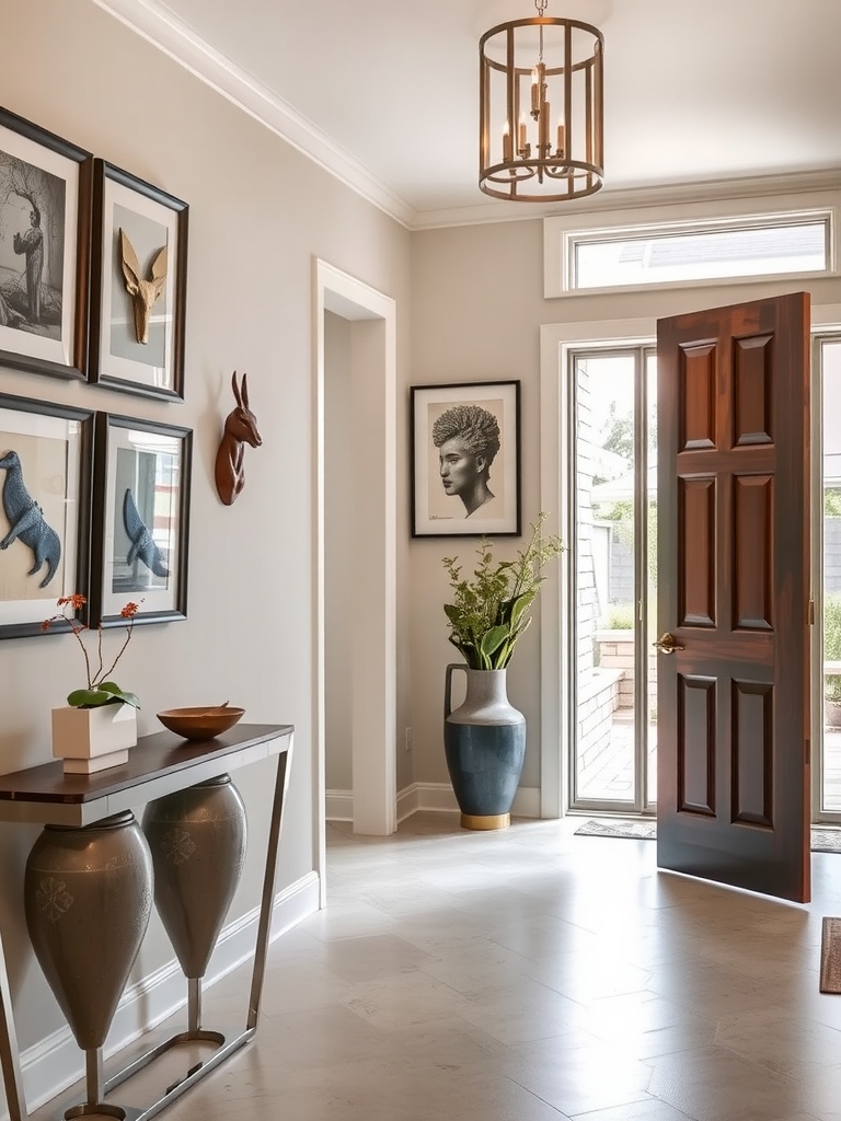 Decorate your walls with unique art pieces that reflect your personality. Whether it’s a striking print, a handcrafted tapestry, or a modern sculpture, these elements add depth and character, making your entryway feel curated and inviting.