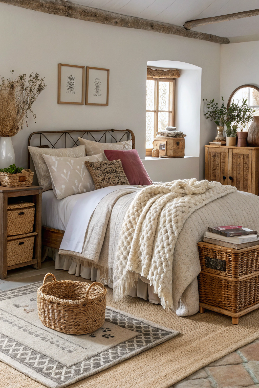 - Woven baskets offering both storage and rustic charm
