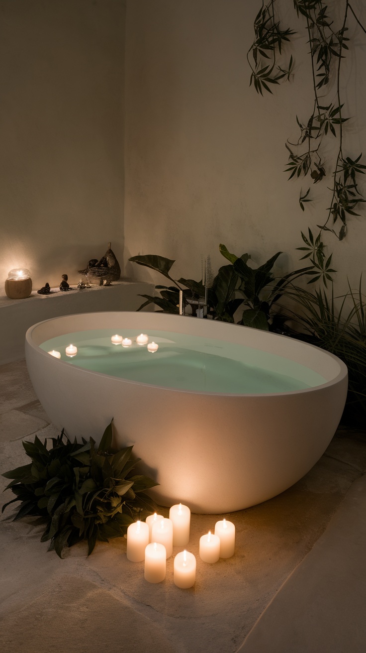 Candle arrangements are a simple yet powerful way to infuse your bathroom with a relaxing spa atmosphere. This design features a tranquil bath surrounded by candles of varying sizes, casting a warm, soothing glow.