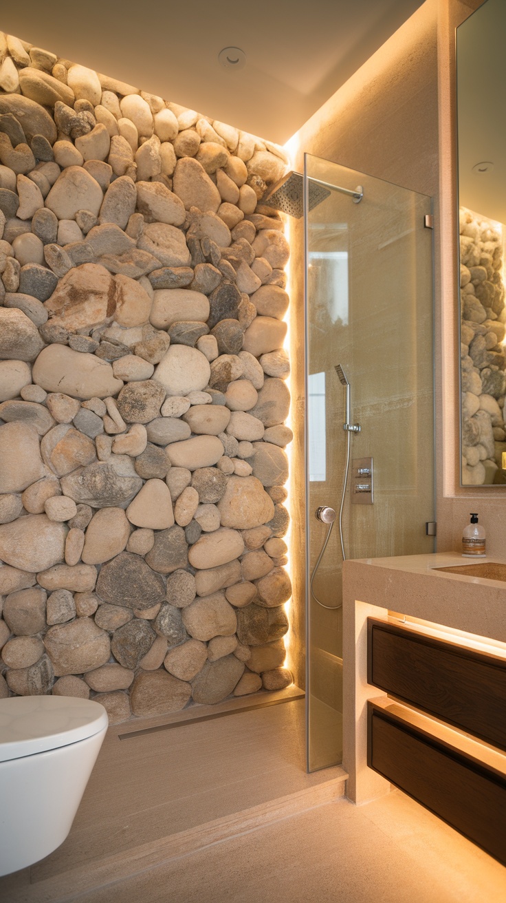 Adding natural stone details instantly elevates your bathroom’s ambiance, creating a peaceful, spa-inspired environment. This example highlights a wall adorned with smooth, rounded stones, evoking the sensation of being immersed in nature.