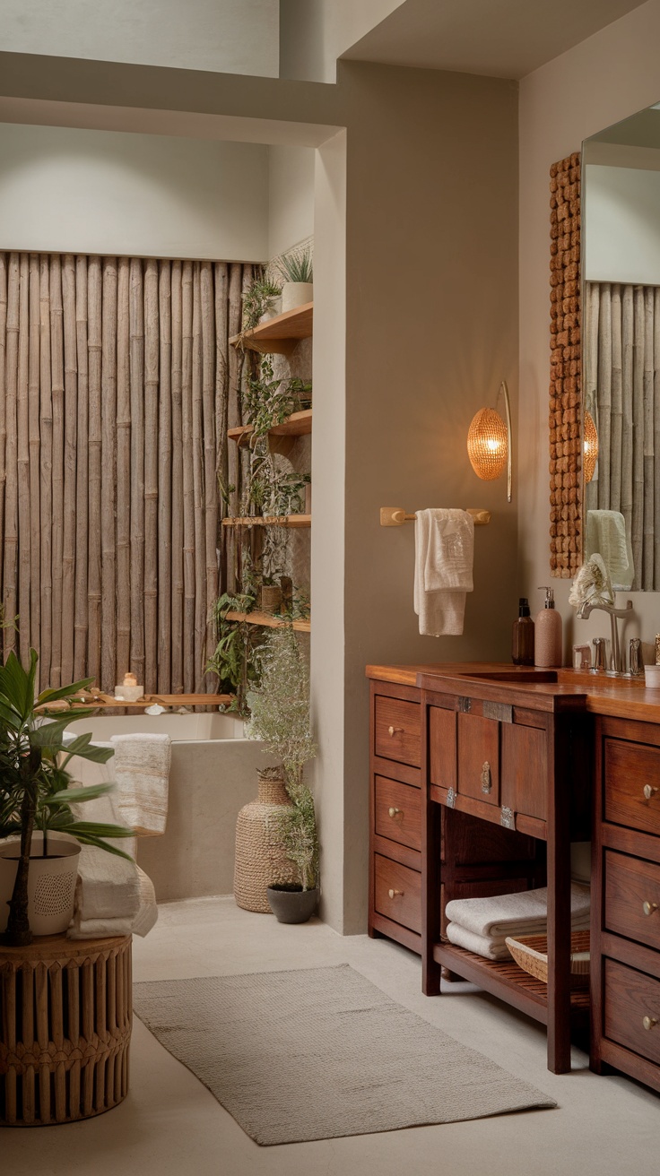 Wooden accents also draw the eye upward, enhancing the perception of space. Pairing wood with lush plants introduces a refreshing vitality, making the bathroom feel alive and rejuvenating. These thoughtful details elevate your bathroom from functional to a personal oasis.