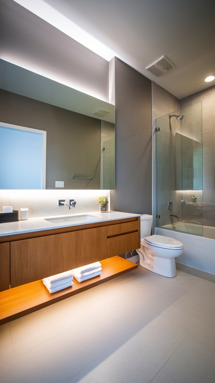 This sleek, modern bathroom highlights underfloor heating complemented by soft lighting and a plush rug, creating an inviting and cozy space. This feature not only boosts warmth but also maintains a clean, minimalist aesthetic, making it ideal for bathroom remodeling and luxury bathroom designs.