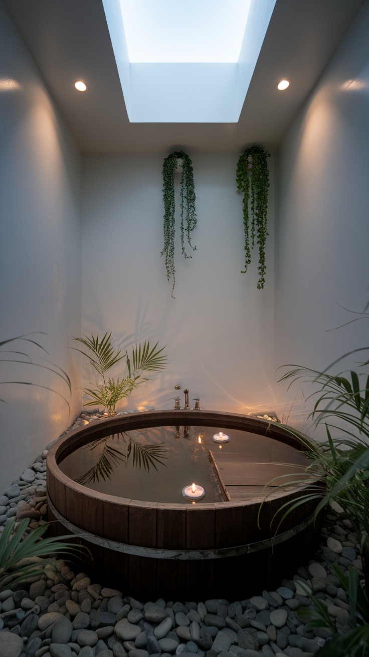 A Japanese soaking tub introduces a serene and elegant element to your spa bathroom. This round wooden tub, set against soft neutral walls, invites you to immerse yourself in warmth and tranquility. Complemented by natural decor like plants and smooth stones, it creates a peaceful mini oasis.
