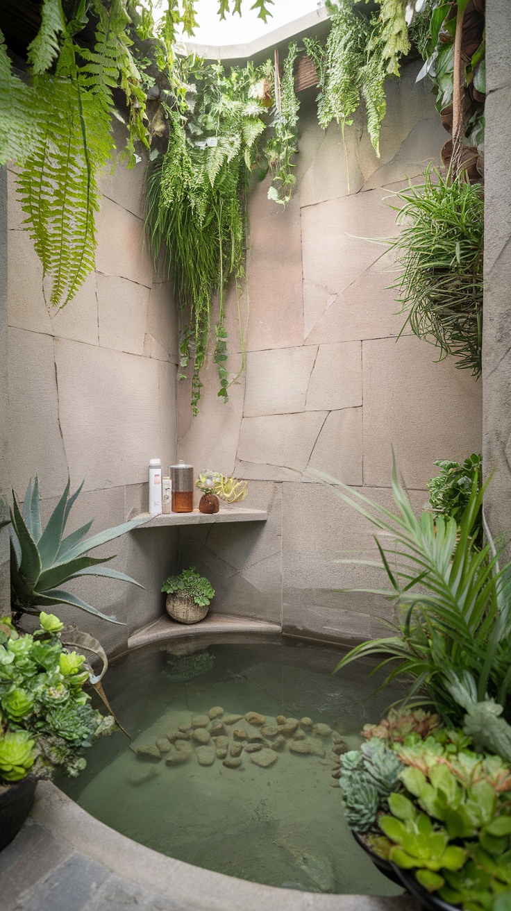 Enhance this sensory retreat by incorporating fresh herbs or aromatic plants near the showerhead, releasing natural oils with the steam. Adding a wooden bench offers comfort and style, completing the tranquil setting.