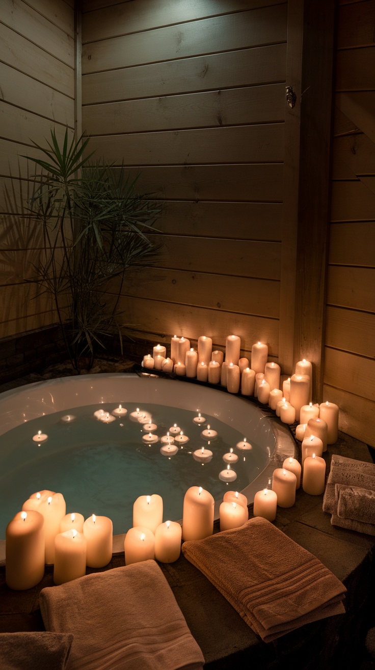 For an enhanced experience, use scented candles to fill the air with relaxing aromas. Pairing candles with plush towels, as shown here, adds an extra layer of comfort and style.