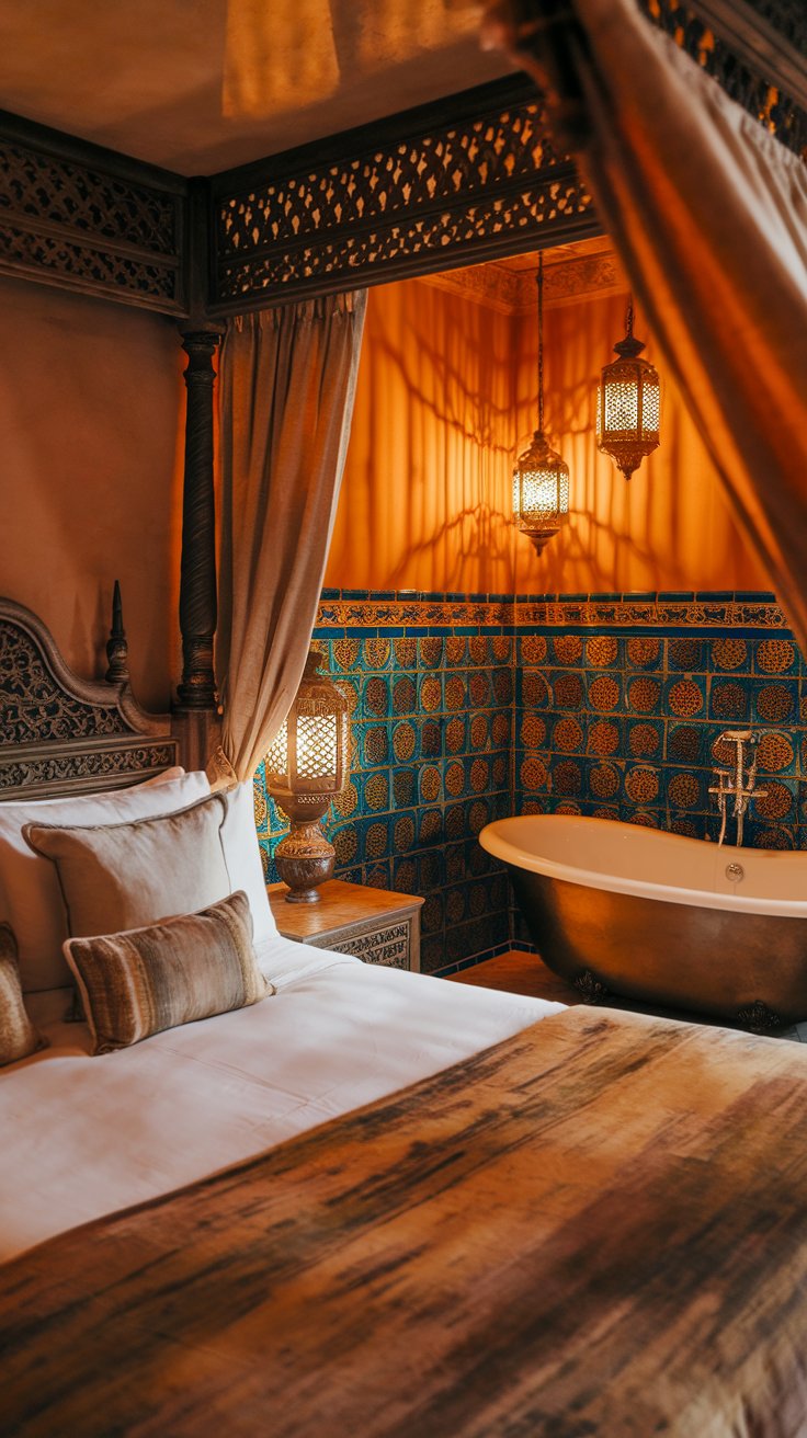 Soft lantern lighting complements the canopy, casting a warm glow that enriches the room’s atmosphere, especially in the evening. For those seeking luxury bedroom inspiration, this combination of sheer drapes and Moroccan accents offers effortless elegance.