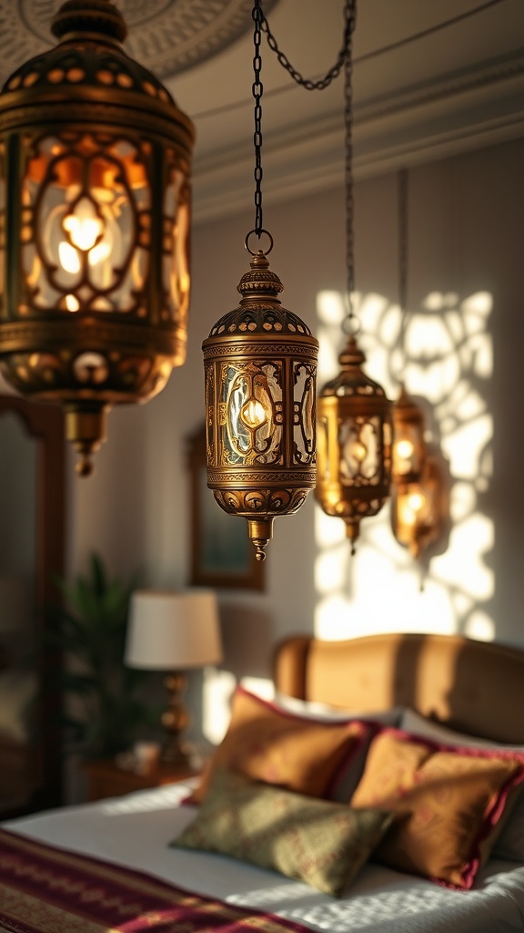 Pair these lanterns with Moroccan rugs to unify the room’s aesthetic. The combination of warm light and ethnic patterns creates a soothing, exotic atmosphere perfect for any bohemian or luxury bedroom design.