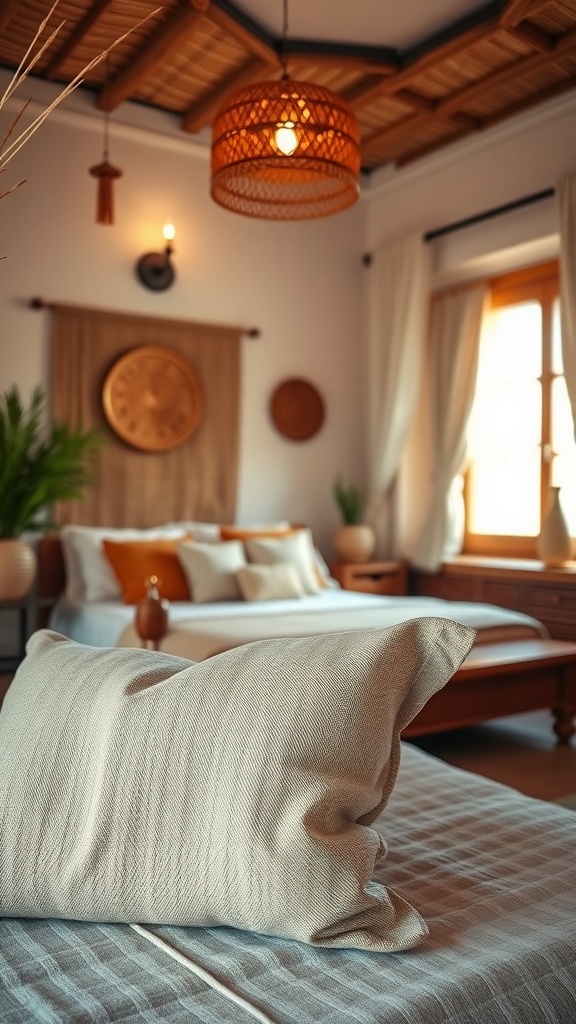Embracing earthy tones and natural elements can effortlessly create a warm, inviting bedroom. This design features a soothing palette of soft neutrals paired with textures like woven wall hangings and wooden furniture, evoking the essence of Moroccan style.