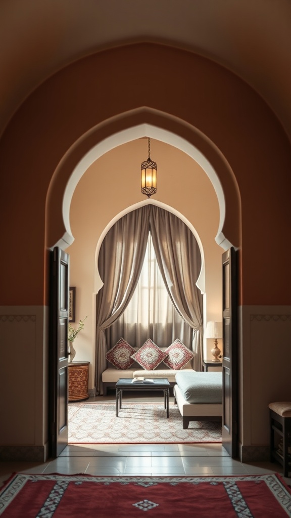 Arched doorways are iconic in Moroccan architecture, adding graceful curves and a sense of flow to interiors. This design highlights a cozy nook framed by an arch, creating a perfect spot for relaxation surrounded by ethnic patterns and warm tones.