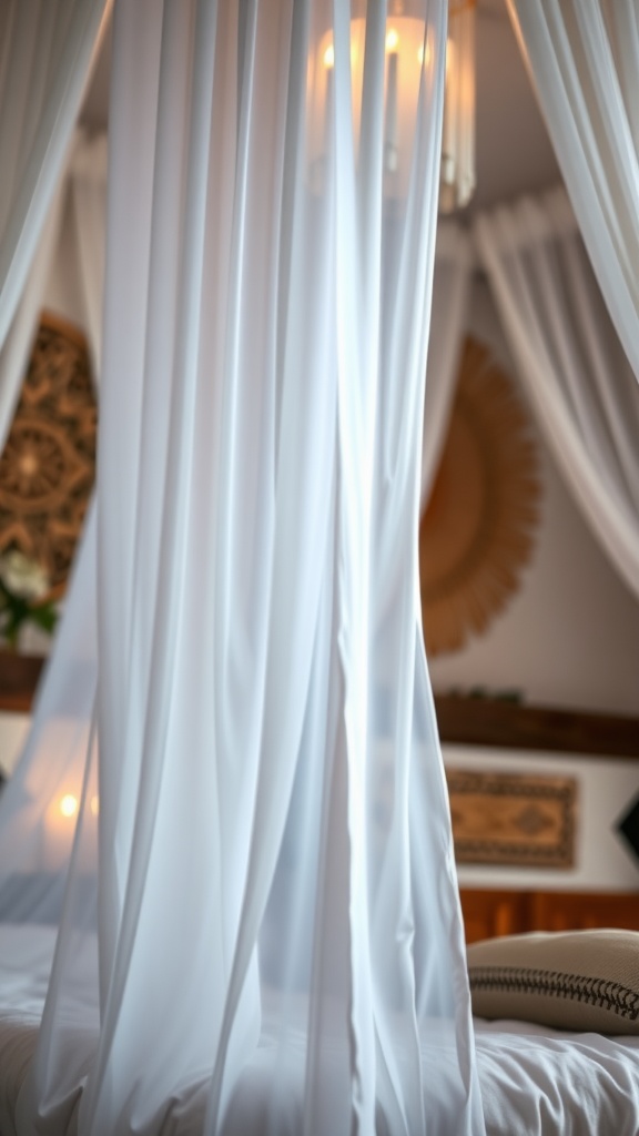 Canopy beds adorned with flowing sheer curtains create an intimate and dreamy ambiance, perfect for a Moroccan-inspired boho bedroom. The translucent fabric softens natural light, adding an ethereal quality to the space.