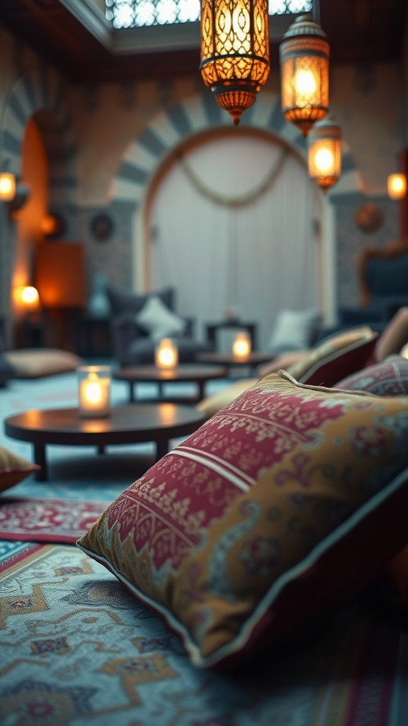 These pieces complement Moroccan rugs and vibrant textiles, turning a simple room into a cozy sanctuary. Adding Moroccan lanterns nearby enhances the ambiance, especially when lit, creating a harmonious blend of texture and light.