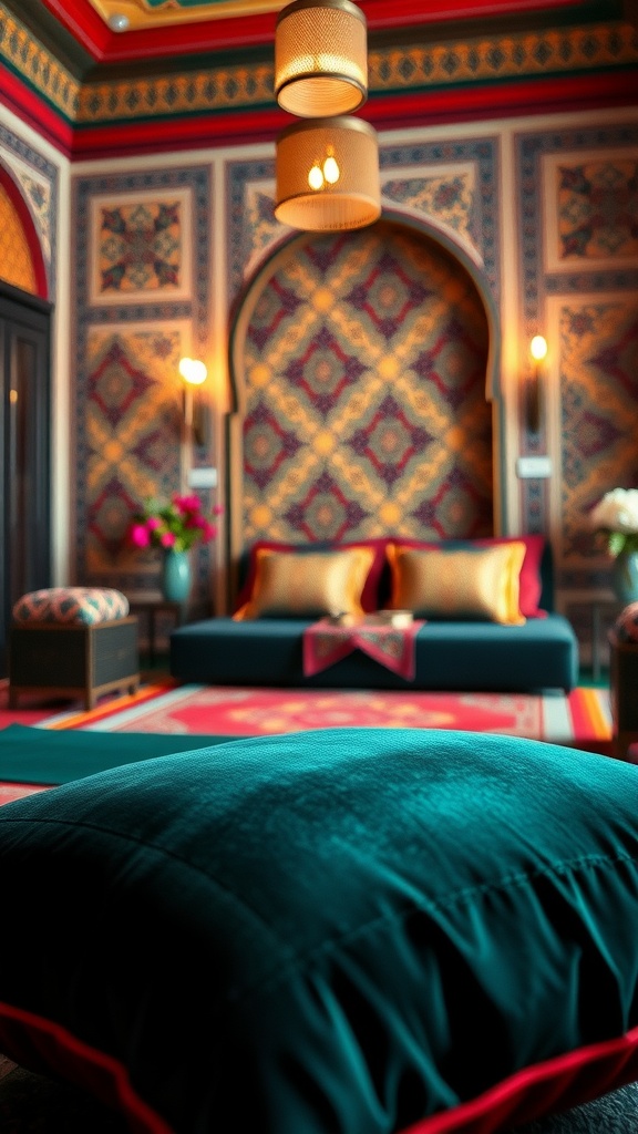 Moroccan interiors are renowned for their rich jewel tones, which create a warm and inviting atmosphere. This bedroom exemplifies the use of deep blues, vibrant reds, and shimmering golds to craft a cozy yet luxurious space.