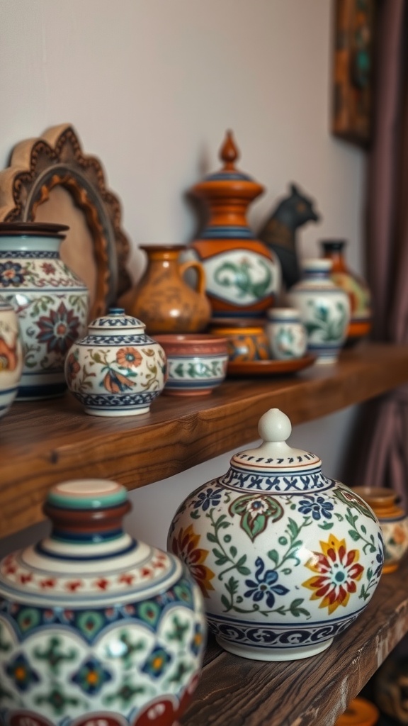 Displayed on rustic wooden shelves, the earthy wood tones contrast beautifully with the pottery’s vivid patterns. When combined with soft textiles and Moroccan rugs, these pieces enhance a luxurious yet inviting bohemian atmosphere.