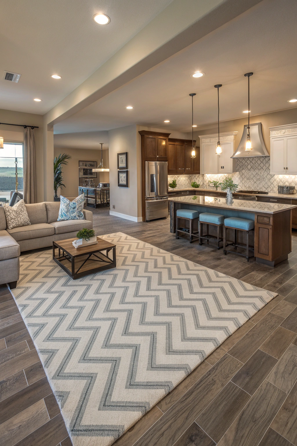 - Place area rugs to define zones