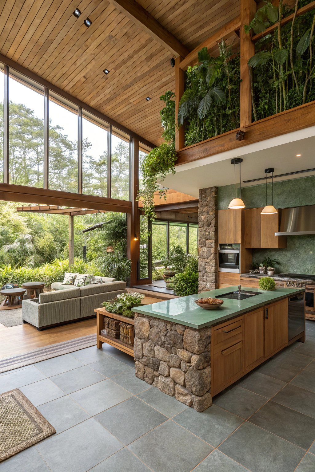 Incorporate natural materials like wood, stone, and bamboo to foster a calming, organic atmosphere. Use a palette of greens and earth tones, and add live plants, herb gardens, or vertical greenery walls to invigorate your open-concept area with freshness and vitality.