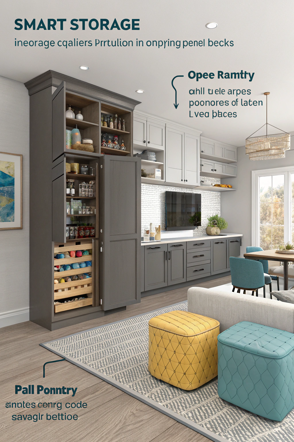 Maximize your space with clever storage ideas that keep your open-concept kitchen and living room tidy and stylish. Consider: