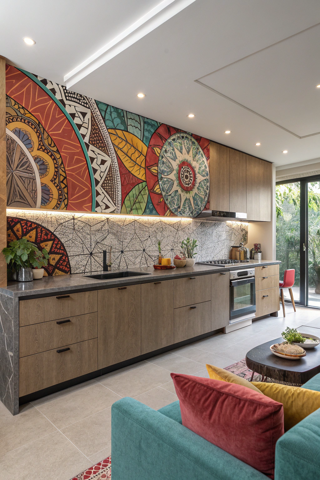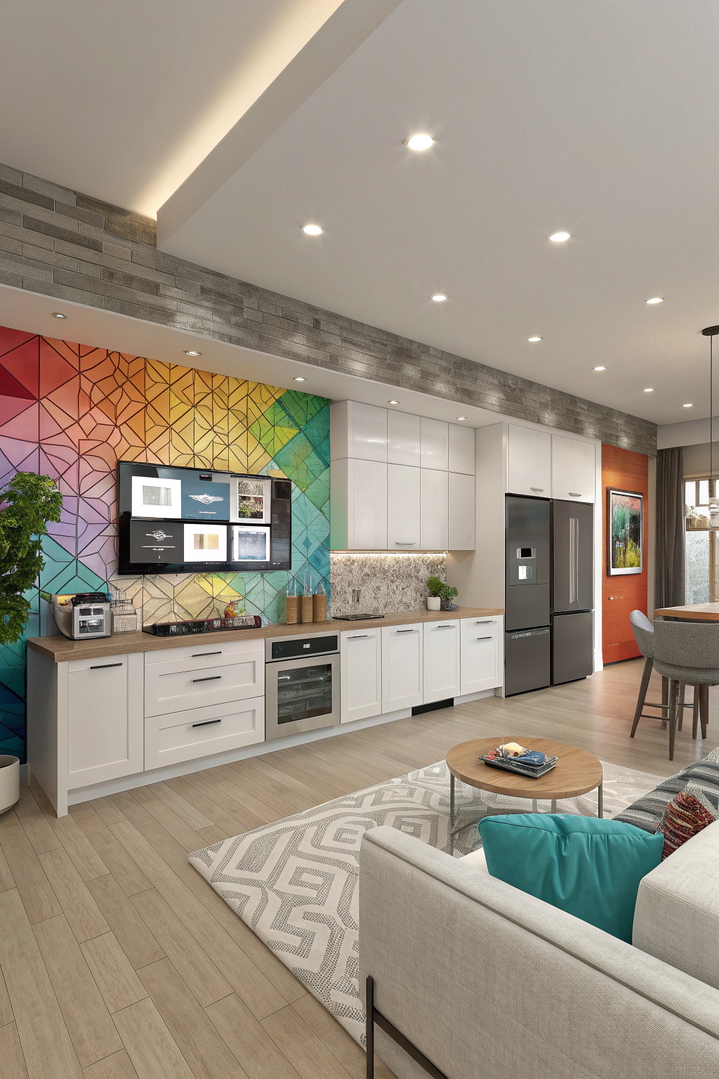Make your backsplash a focal point by choosing artistic designs that unify your kitchen and living room. Options include bold tile patterns, colorful murals, or textured glass panels. This feature not only adds visual interest but also reflects your personal style, creating a captivating centerpiece.