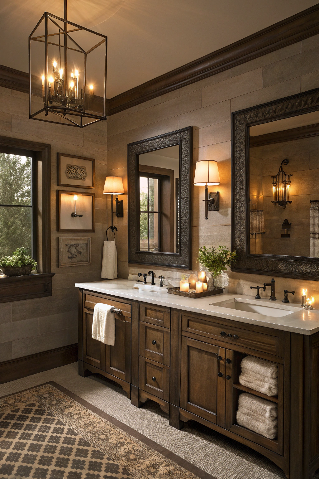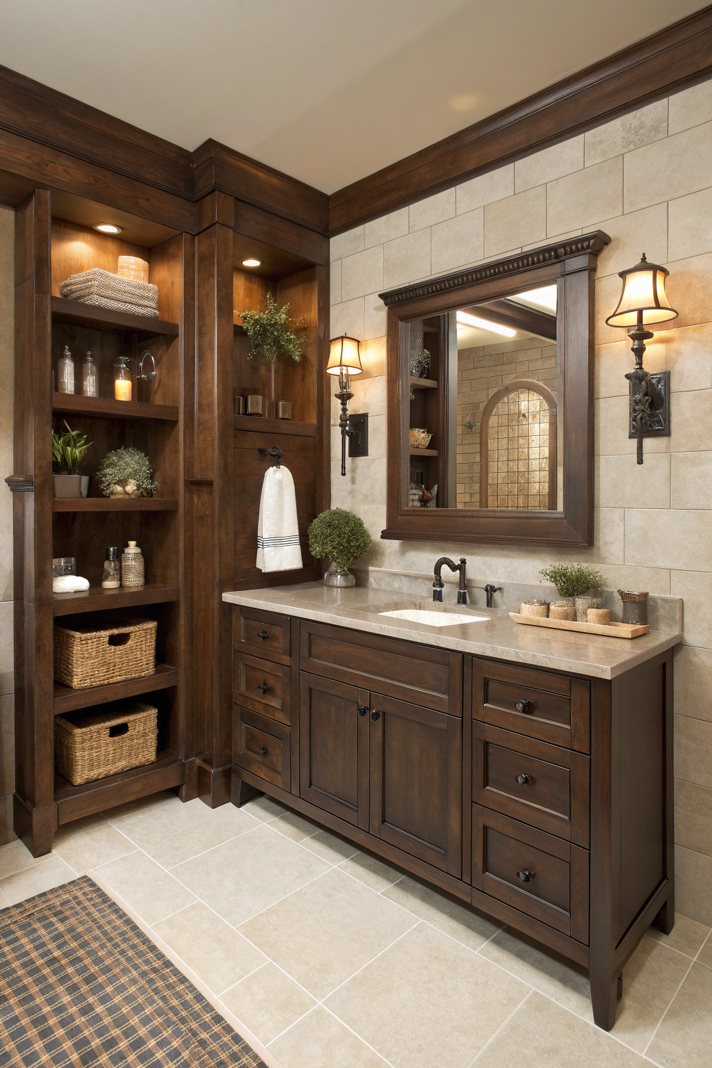 Soft, adjustable lighting is key to making a dark bathroom feel warm and welcoming. Use dimmable LED lights or soft white bulbs to create a gentle glow. Wall sconces add elegance and diffuse light evenly, while decorative lanterns or candles can enhance the ambiance. Additionally, lighted mirrors provide both functionality and a subtle warmth without overpowering the space.
