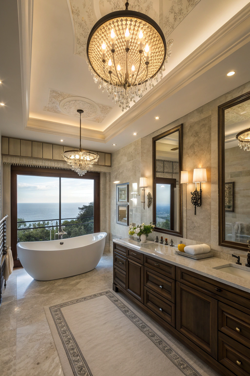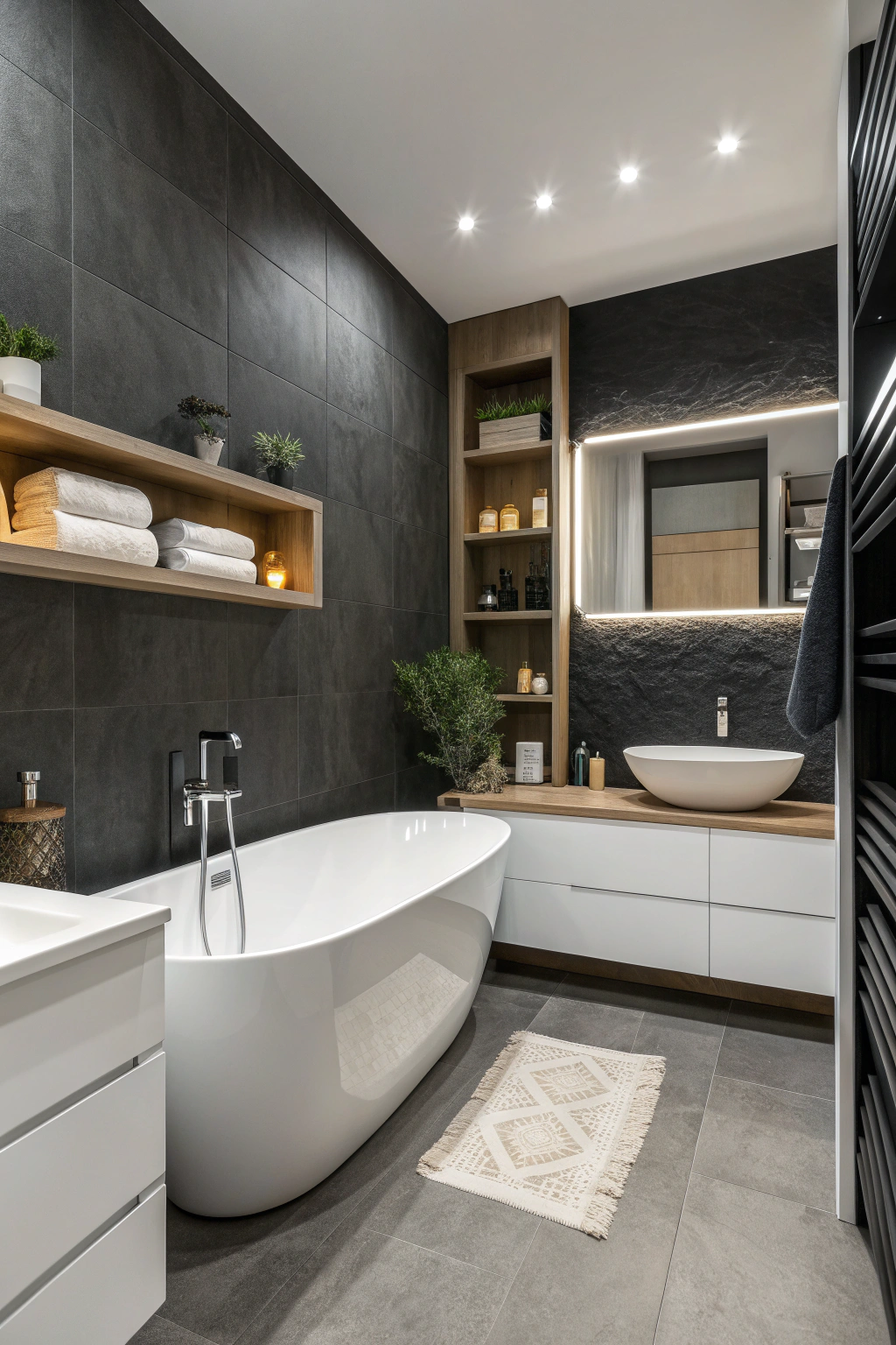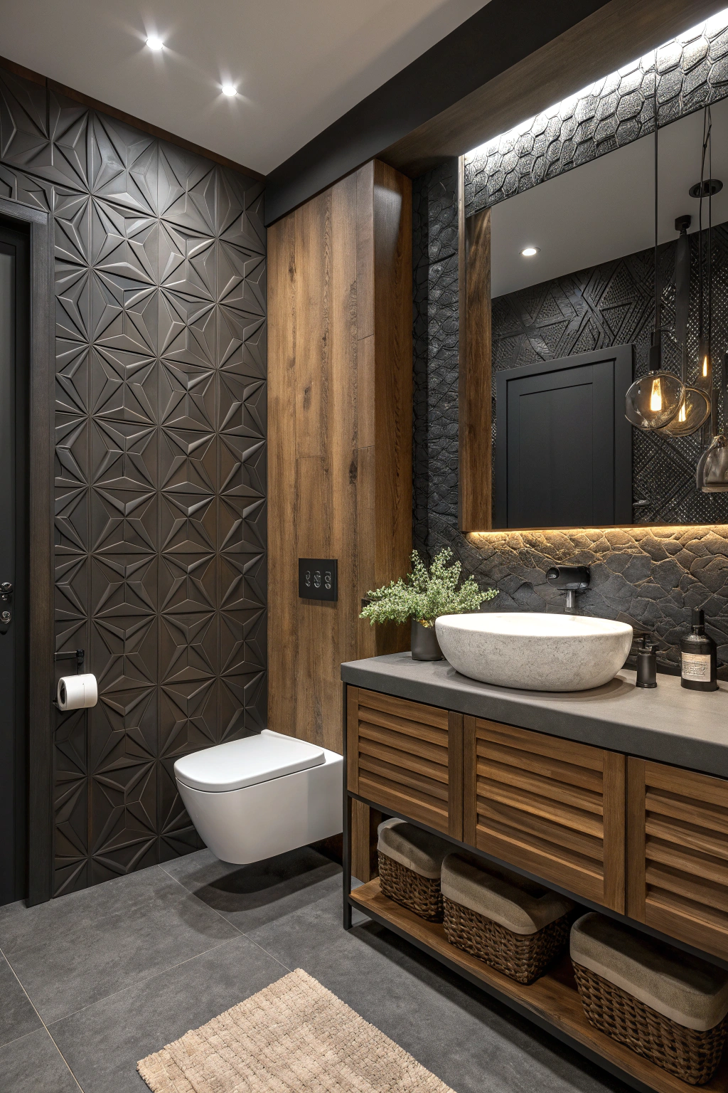 Lighting plays a pivotal role in defining the mood of a dark-themed bathroom. Consider installing statement pendant lights or an eye-catching chandelier to serve as a centerpiece. Incorporate dimmer switches to tailor the brightness to your needs, whether for energizing mornings or relaxing evenings. Layered lighting-combining wall sconces, LED strips, and ambient sources-adds dimension and warmth, ensuring your bathroom feels both inviting and sophisticated.