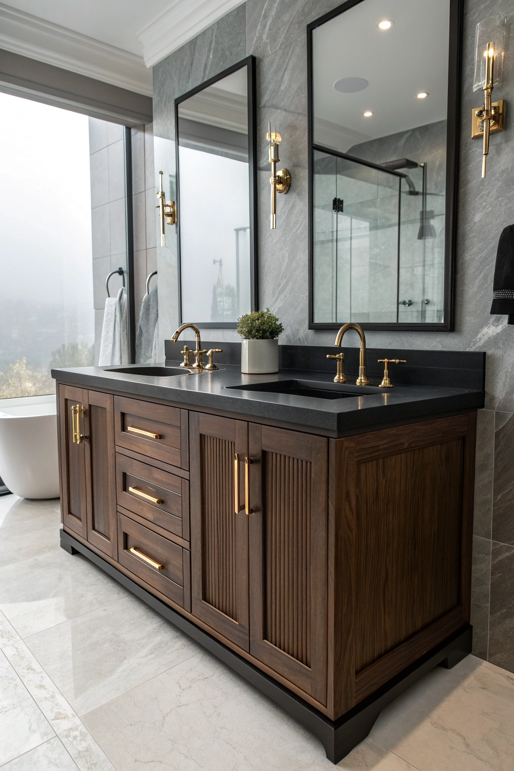 Choosing a vanity in a dark finish combines practicality with style. Materials like ebony wood or matte black laminates paired with gold or brass hardware can elevate your bathroom’s aesthetic. For larger spaces, a double sink vanity enhances functionality without compromising elegance. This blend of form and function ensures your bathroom remains both beautiful and efficient.