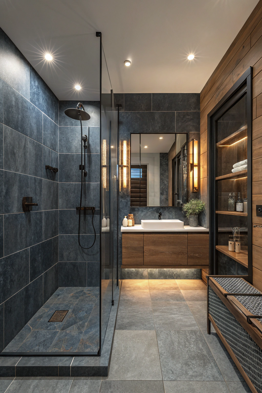 Designing a shower area with deep, rich tones like slate or navy can turn your bathroom into a serene retreat. Complement these colors with matte black fixtures and minimalist hardware for a cohesive, modern look. Frameless glass doors maintain an open feel, while adjustable lighting adds warmth and comfort during your daily routine.