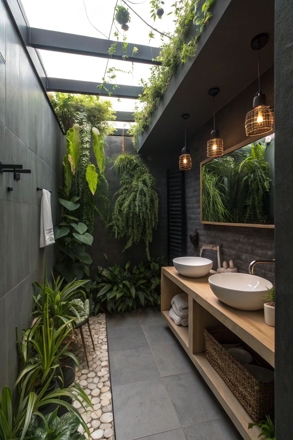 Introducing plants into darker bathrooms can create a refreshing oasis, even with limited sunlight. Select hardy, low-light plants such as snake plants, pothos, or ZZ plants that thrive in shaded environments. Display them on shelves or suspend them from the ceiling to add layers of greenery. Besides enhancing aesthetics, these plants improve air quality, contributing to a tranquil and healthy space.