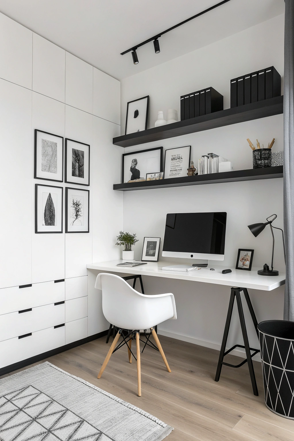 Adopting a minimalist black and white theme can turn your office into a chic, contemporary sanctuary. Focus on streamlined furniture with clean silhouettes and ample negative space to avoid clutter. Use monochrome accents such as framed prints or desk accessories to maintain visual harmony. This style not only sharpens focus but also instills a sense of calm and order, ideal for high-concentration tasks.