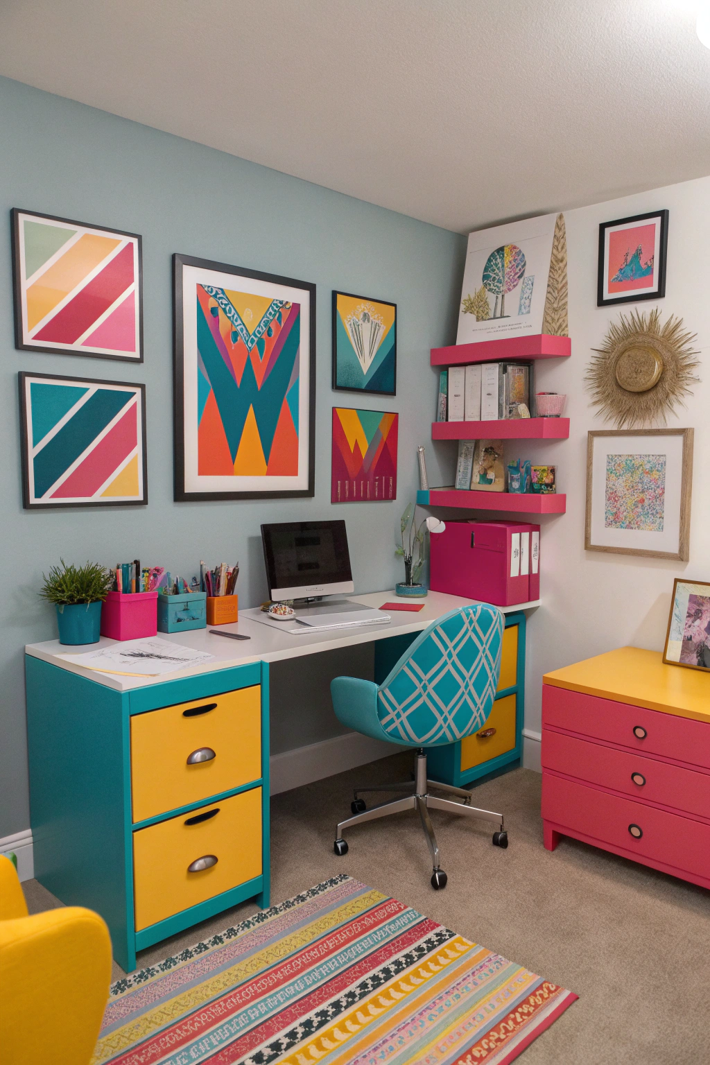 - Colorful crates used as storage units, injecting a playful vibe.
