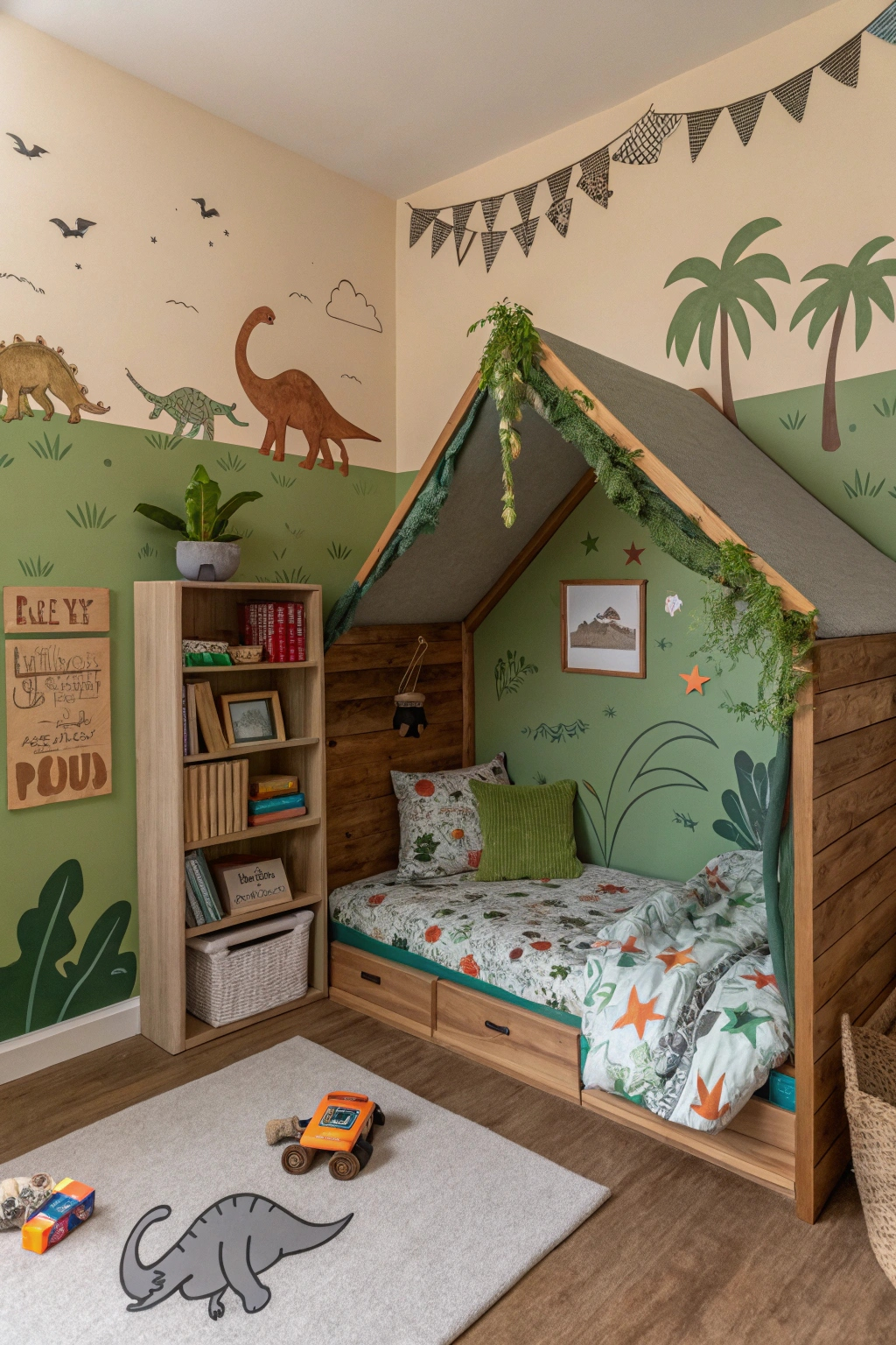 For kids fascinated by prehistoric creatures, a dinosaur-themed room can be an exciting prehistoric playground. Use earthy or vibrant green tones on the walls, and add dinosaur-themed bedding and plush toys. Wall decals of various dinosaurs add a fun visual element. Create a cozy reading nook stocked with dinosaur books to encourage learning and imagination.