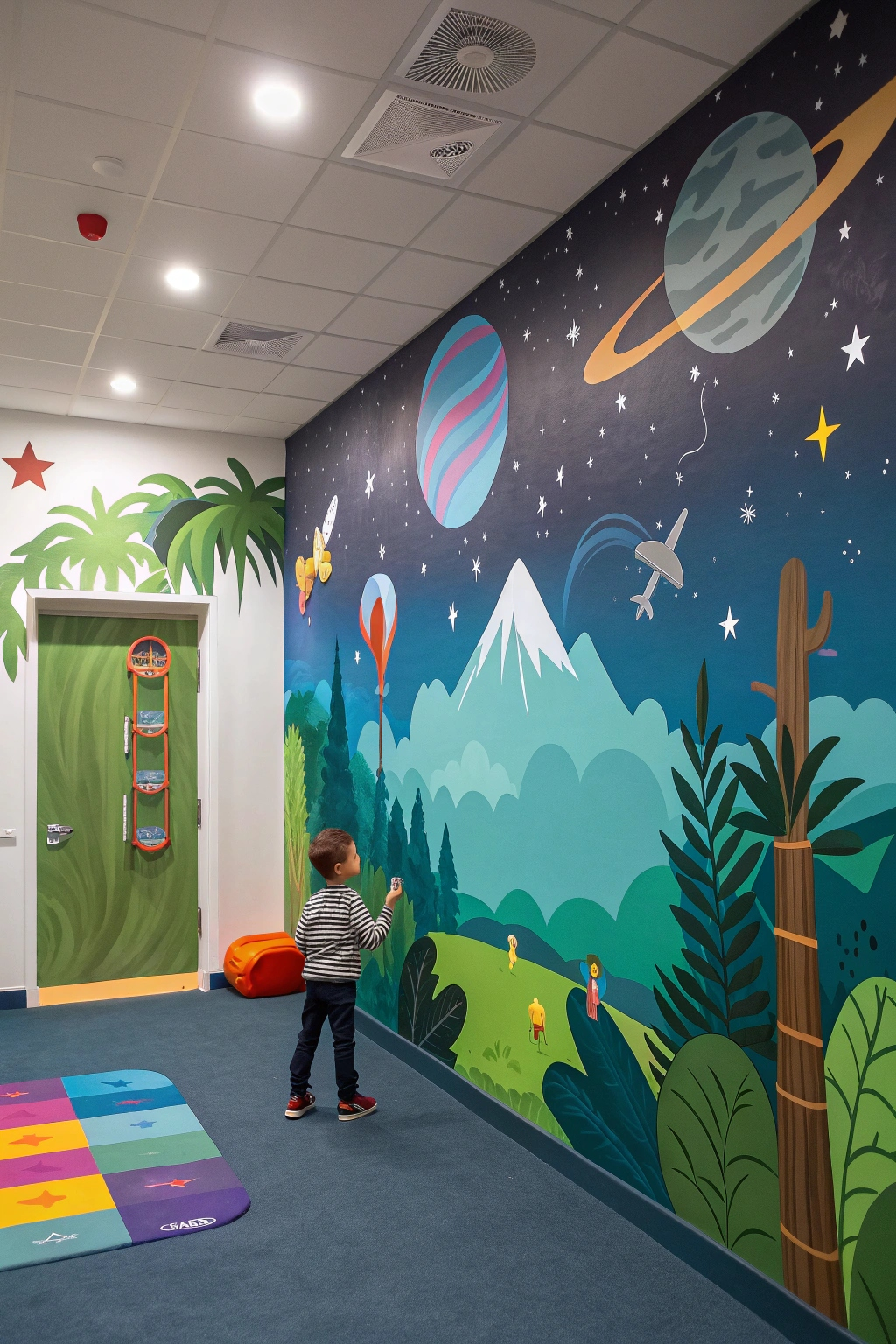 Transform plain walls into portals of adventure with vibrant murals depicting jungles, mountains, or outer space. These artistic backdrops stimulate imagination and encourage your child to embark on exciting journeys without leaving their room.
