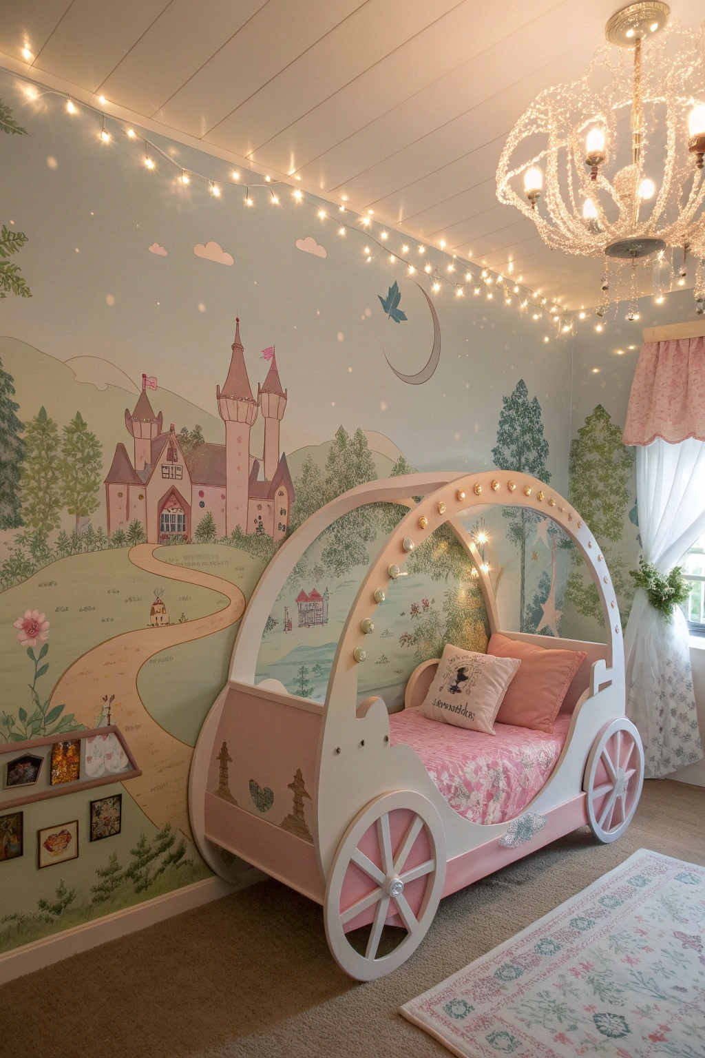 Bring storybook magic to life with a fairy tale-themed room. Use murals of castles and enchanted forests, and consider a bed shaped like a royal carriage. Soft, colorful bedding paired with fairy lights creates a dreamy atmosphere. Add storybooks and themed décor to inspire daily imaginative play.