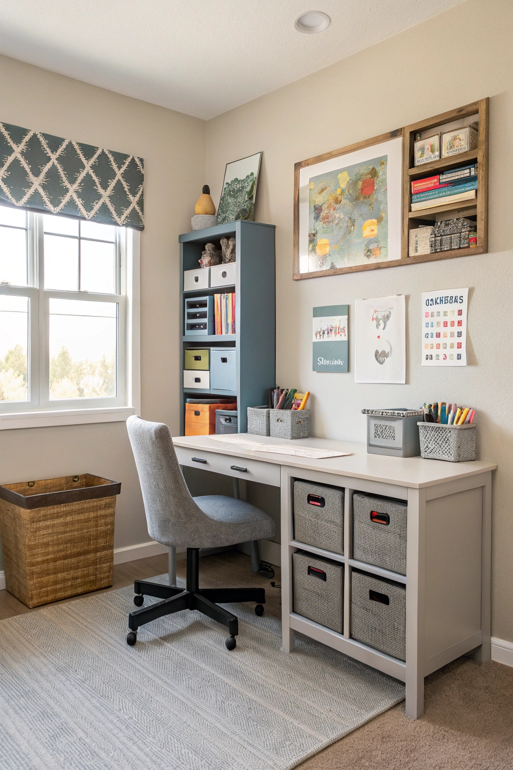 - Organized storage: Bins or drawers to neatly hold art supplies.