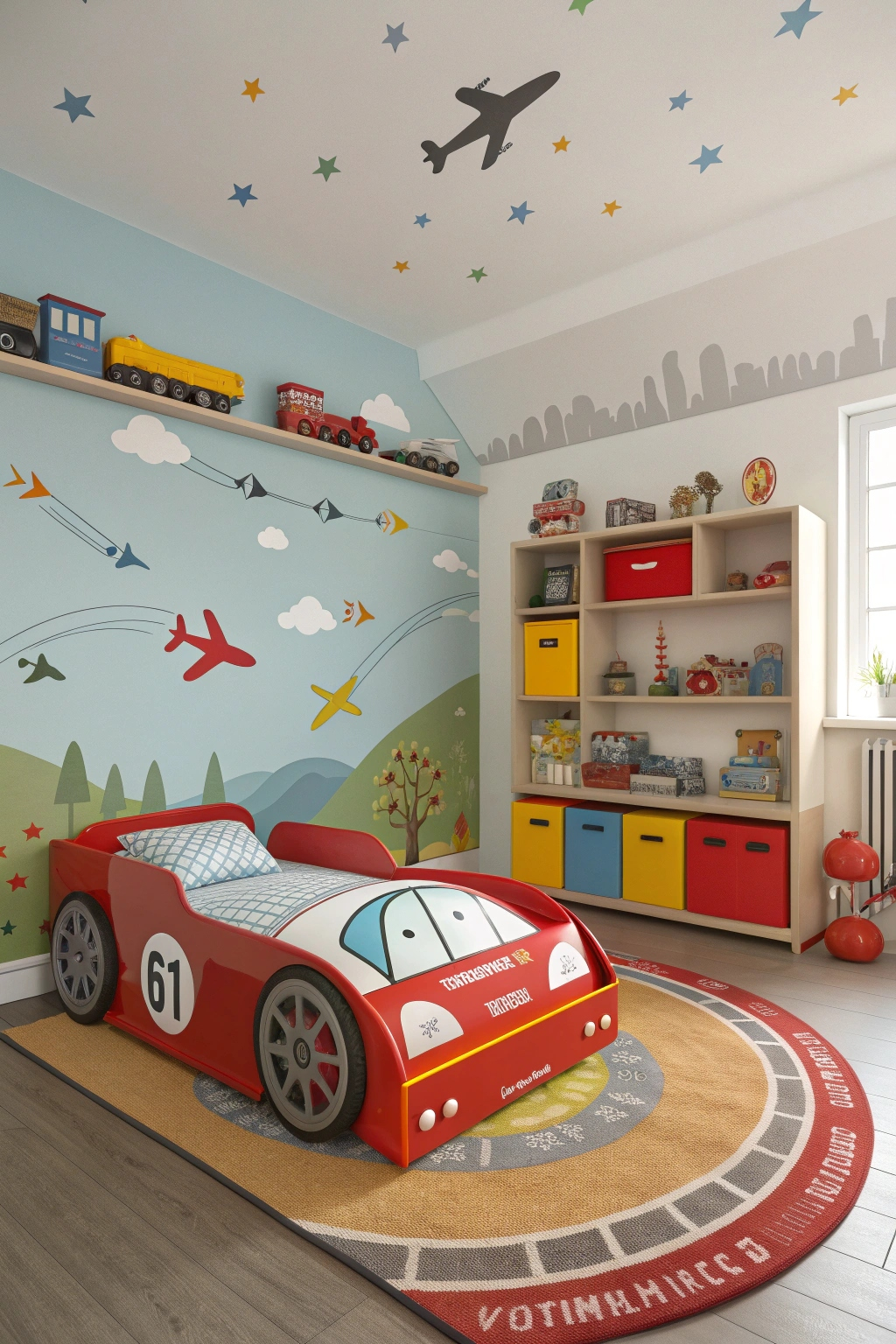 Fuel your child’s sense of adventure with a transportation-themed room filled with vehicles and travel motifs. Use bright colors and wall decals of airplanes, trains, or cars. A race car-shaped bed adds excitement, while storage resembling luggage or fuel tanks enhances the theme. This dynamic space encourages imaginative play and exploration.