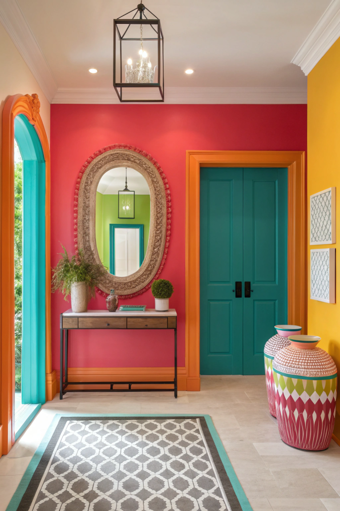 While vibrant colors energize your entryway, a standout mirror can amplify both light and space. Opt for a mirror framed in an unconventional material like reclaimed wood or brushed brass, or choose an asymmetrical shape to reflect your unique taste. Beyond its practical use, a well-chosen mirror visually expands the area, making your foyer feel more open and welcoming.