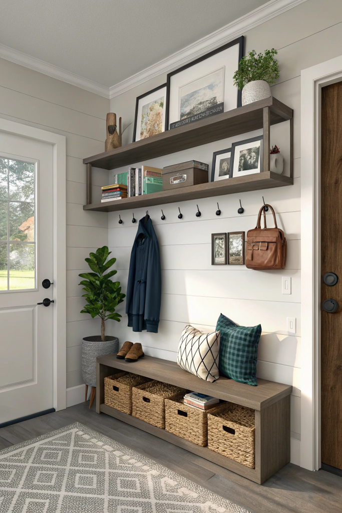 Floating shelves offer a sleek solution to blend storage and style in your entryway. Use them to display treasured items or keep everyday essentials within reach. Ideas for your shelves include:
