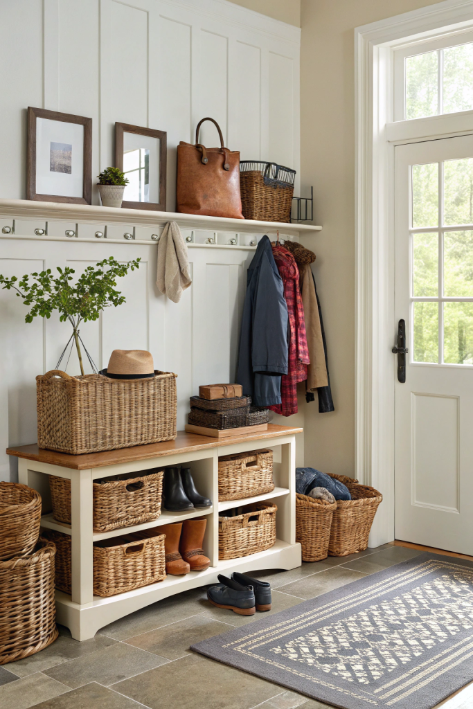 Wicker baskets blend rustic charm with practicality, perfect for corralling clutter in your entryway. Use them to store footwear, umbrellas, or pet accessories. Arrange baskets of varying sizes on shelves or beneath furniture for easy access and visual interest. The natural textures add warmth and complement diverse decor styles.