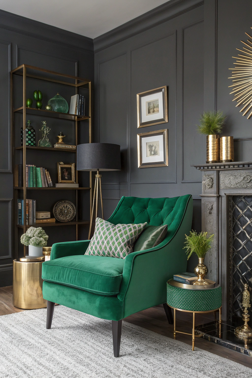 For a living room that radiates luxury and depth, charcoal paired with emerald green is an exceptional choice. Charcoal’s dark, neutral tone provides a dramatic backdrop, while emerald green adds a lush, vibrant touch through furniture or accent pieces like cushions and chairs. To elevate this palette, incorporate metallic finishes such as gold or silver in lighting fixtures or decorative accessories, enhancing the room’s opulence and warmth.