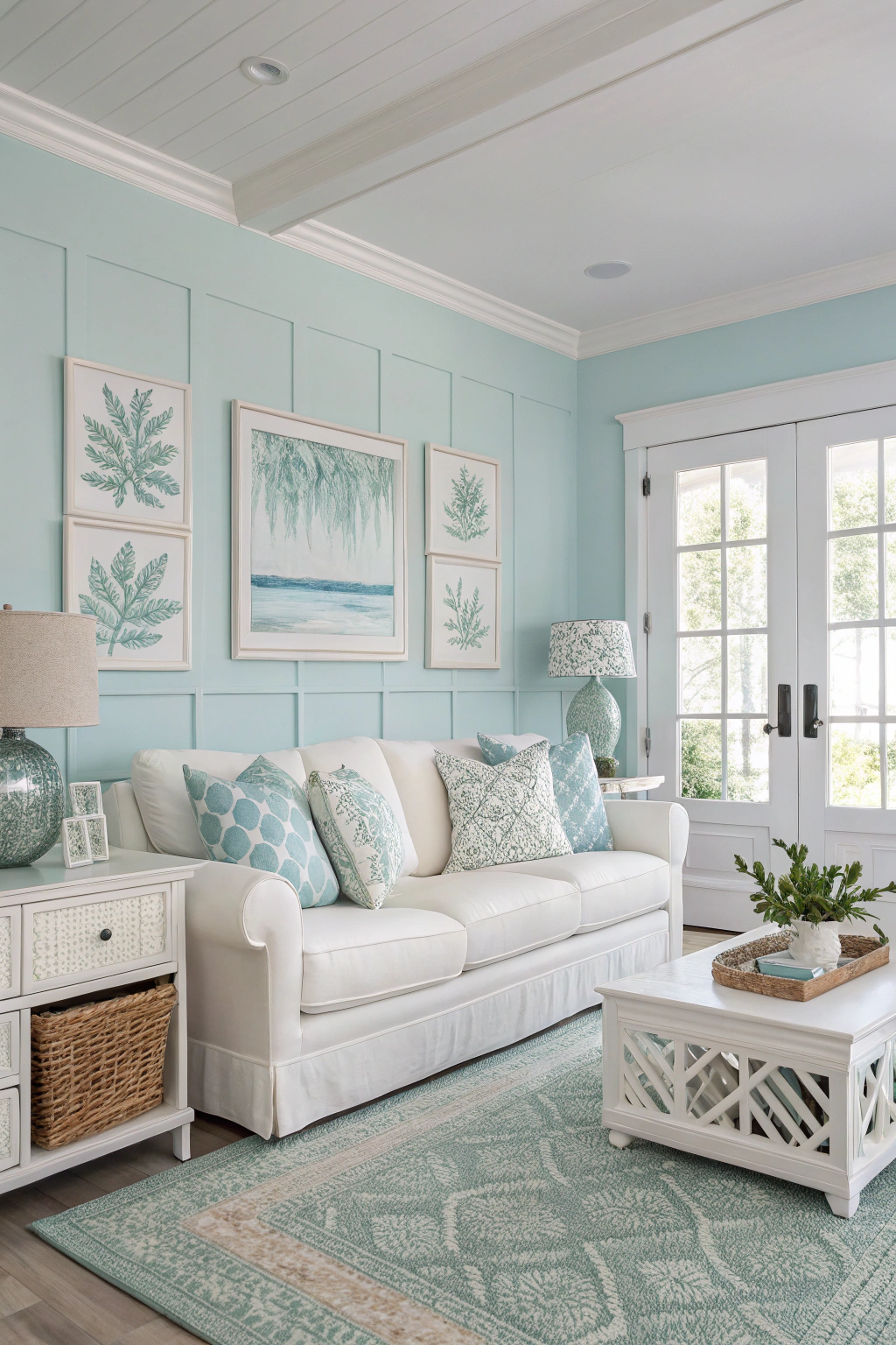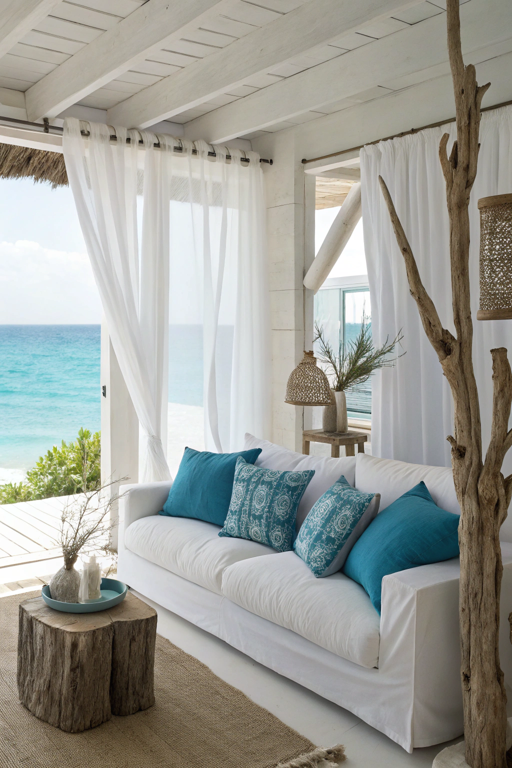 Bring the tranquility of the sea indoors with a soothing blend of crisp white and ocean blue. This palette evokes a fresh, airy feel reminiscent of coastal retreats. To enhance this look: