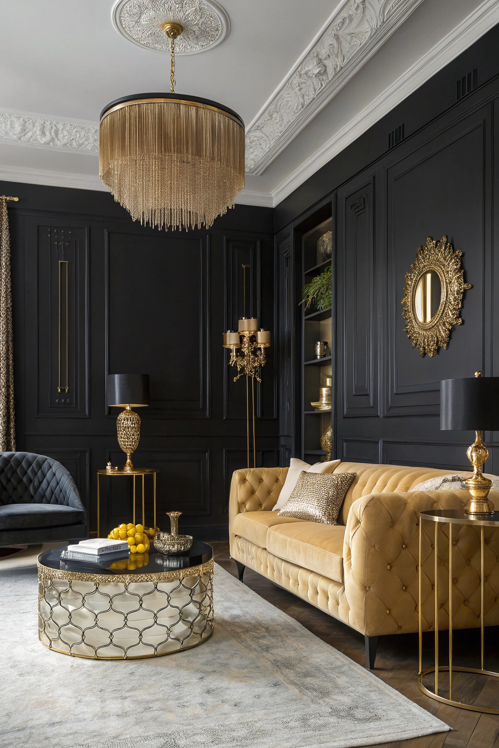Elevate your living room with the opulent contrast of black and gold. Use black as a dominant color on walls or furniture to create depth, while gold accents in lighting, decor, or textiles add a luxurious sparkle. This combination exudes sophistication and timeless elegance, perfect for those who want a bold yet inviting space.