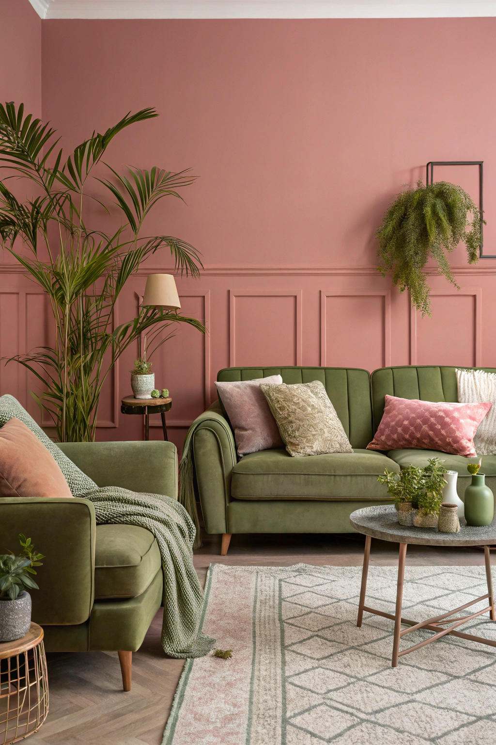 The blend of dusty rose and olive green offers a cozy yet refined palette. This combination is ideal for creating a tranquil and inviting living room. To enhance this look: