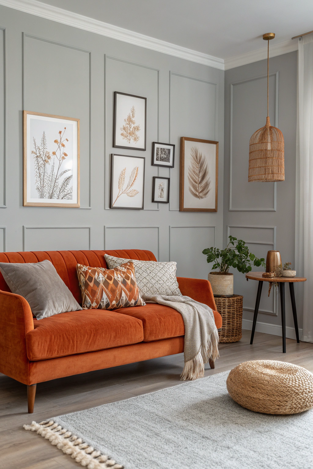 For a lively and balanced living room, consider the energetic pairing of burnt orange and light gray. Burnt orange adds warmth and vibrancy through accent pieces like cushions or artwork, while light gray provides a neutral backdrop that keeps the space grounded and sophisticated.