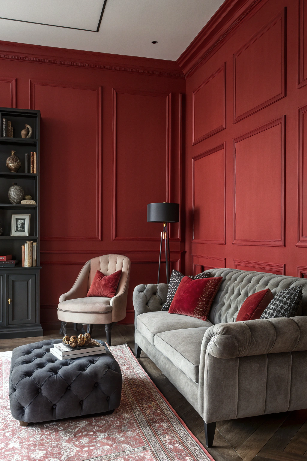 Deep red paired with charcoal creates a warm and sophisticated atmosphere. Use deep red for accent walls or plush furnishings to introduce boldness, balanced by charcoal furniture or textiles that add sleekness and depth. This combination invites both comfort and elegance, perfect for a stylish living room.