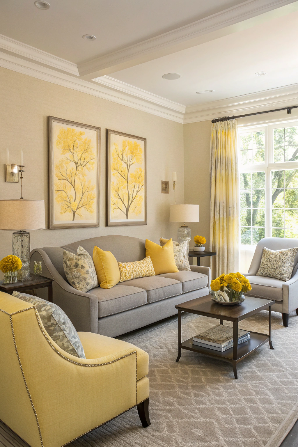 Soft yellow paired with gray brings a lively yet balanced energy to your living room. This combination is ideal for creating a welcoming space for both relaxation and social gatherings. To maximize this effect, try: