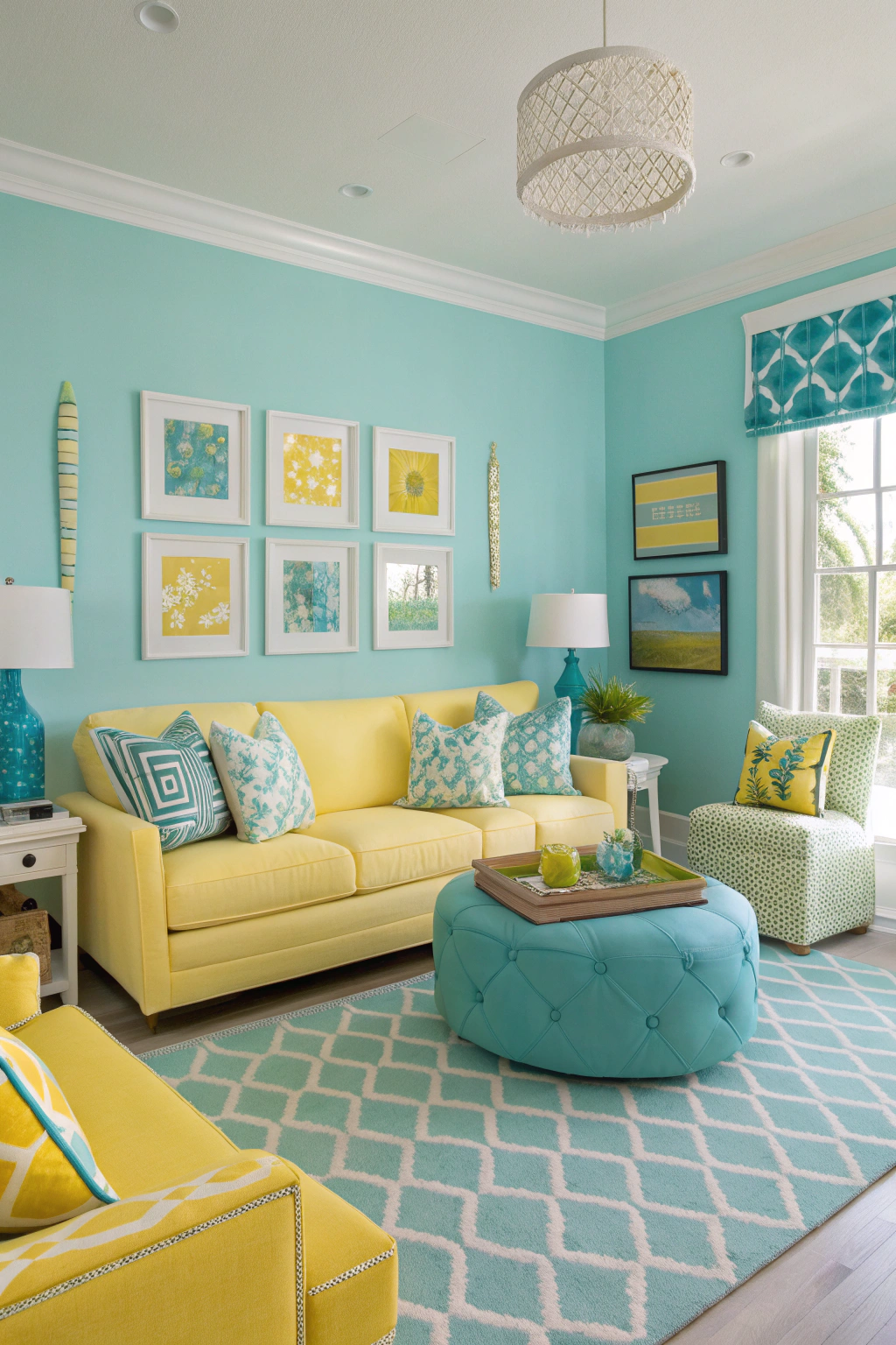 Bright cyan combined with lemon yellow creates an invigorating and cheerful living room. This energetic palette is perfect for spaces meant to inspire creativity and joy. Use bright cyan on walls or furniture, complemented by lemon accents in cushions, artwork, or decorative pieces. This pairing ensures your living room feels lively and welcoming.