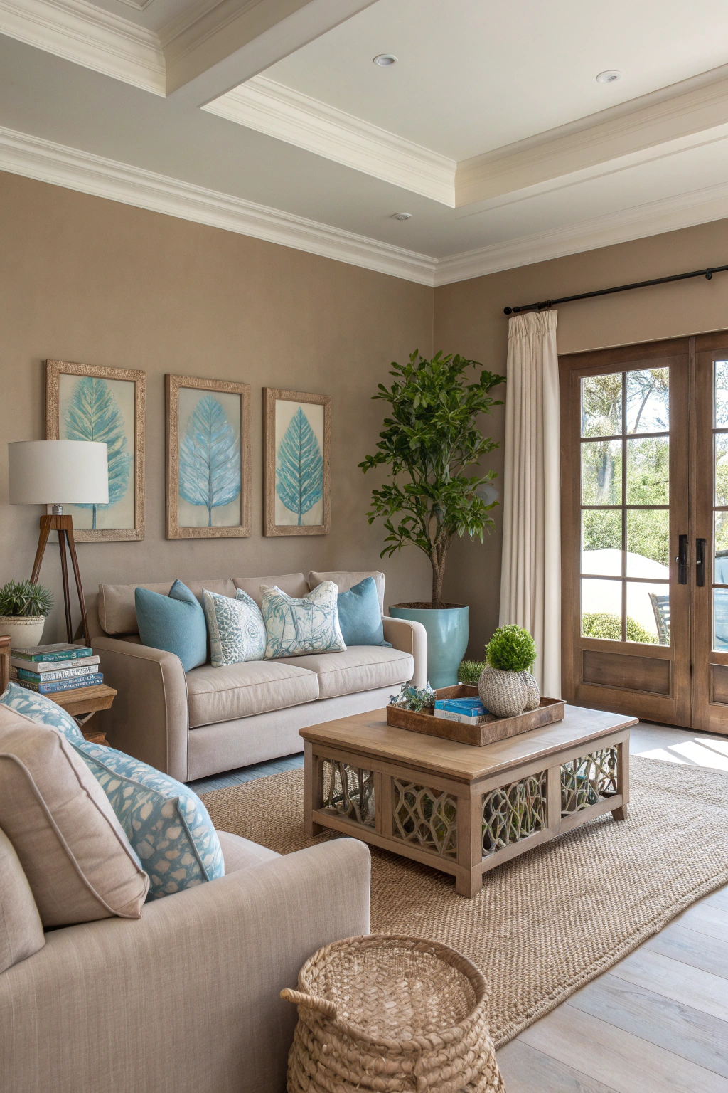 Earthy taupe paired with sky blue creates a harmonious and calming living room environment. To enhance this palette, consider: