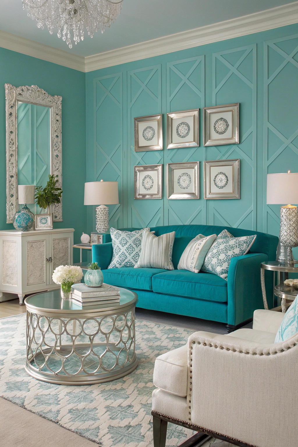 Vibrant turquoise paired with silver accents creates a lively yet refined living room. Turquoise can be introduced through accent walls or furniture, while silver adds a touch of sophistication via lamps, frames, or decorative objects. Adding white or cream elements helps balance the vibrancy, resulting in an inviting and energetic space.