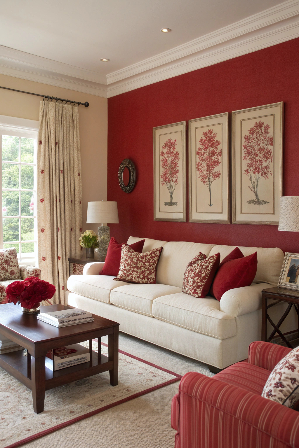 Cherry red combined with soft ivory creates a lively yet balanced living room. Use cherry red for accent walls, cushions, or artwork to energize the space, while soft ivory furniture and textiles soften the overall look. This pairing fosters a cozy and inviting environment, ideal for both relaxation and entertaining.