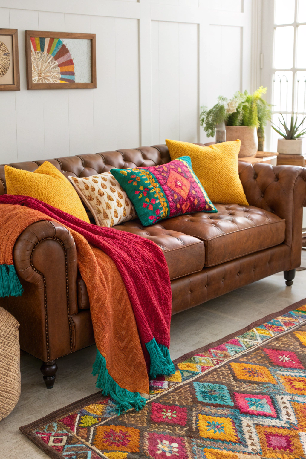 Revitalize your brown leather sofa by introducing lively textiles. Bright throw pillows or a patterned blanket can create a captivating contrast that enlivens the room. Consider anchoring the space with a vibrant area rug featuring geometric or floral motifs. These colorful accents not only highlight your sofa but also inject energy and personality into your living space.