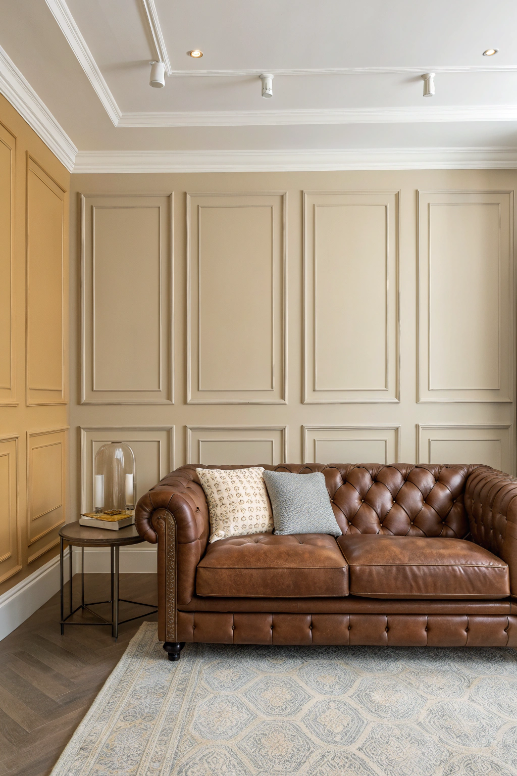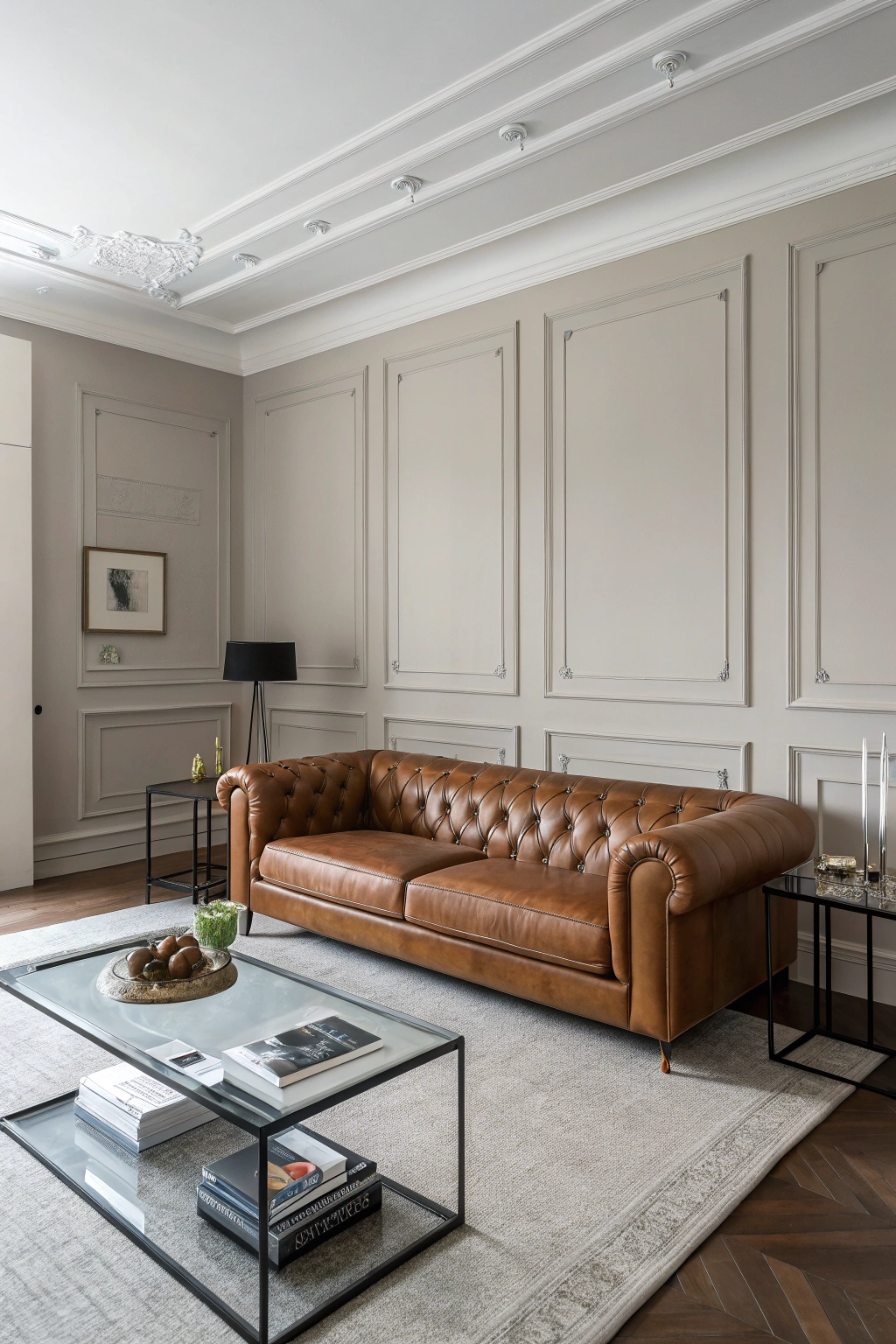 Pairing your brown leather sofa with neutral-colored walls creates a harmonious and polished look. This combination allows the sofa’s rich hues to stand out against a calm, understated background. Consider shades such as: